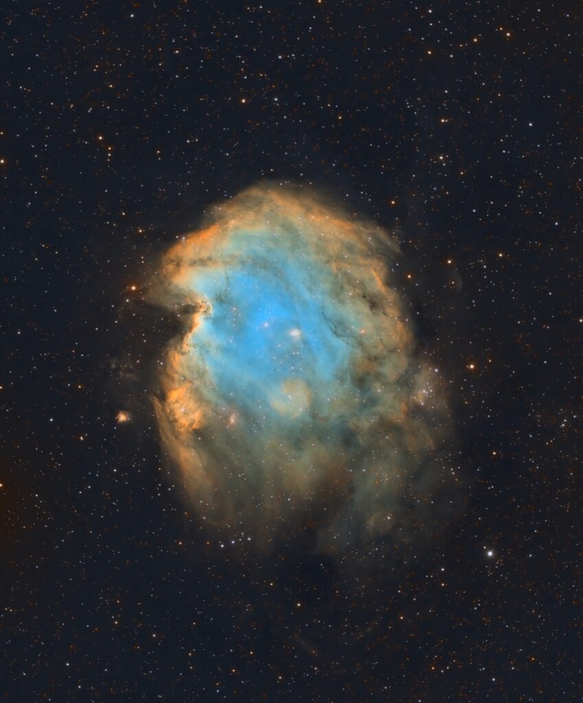 暱稱是猴頭星雲(Monkey’s Head Nebula)的 SH2-252(或 NGC 2174)位於獵戶座右肩紅巨星參宿四的上方、介於雙子座與獵戶座之間,估計是因為形狀像是猴子的側顏而得名,由電離狀態的氫氣(H II)組成。NGC 2175 是位於星雲中央的疏散星團,由多顆年輕的恆星組成。強大的恆星風把周遭的星際物質往外推送,形成複雜的星雲外形。這是窄頻(narrowband)的影像,因此星雲以及星星的顏色都是偽色。因為電離氫的緣故, SH2-252 在可見光的波段看起來其實是紅色的。